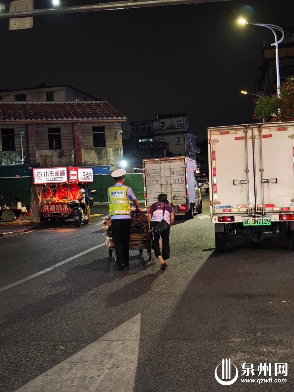 昨日,记者联系到鲤城交警大队,相关民警还原了当时的情景:10月26日0点30分许,鲤城交警大队的执勤人员小张在义全街与天后路交叉路口维护交通秩序时,发现一名阿婆推着满满一车废纸板,步履蹒跚地在路口穿行,车上的纸板不时掉落,给她增加了困难。见此情景,小张立即快步上前,接过阿婆手中的车将其推到路边,协助她将纸板重新规整装车,并护送她安全通过马路。