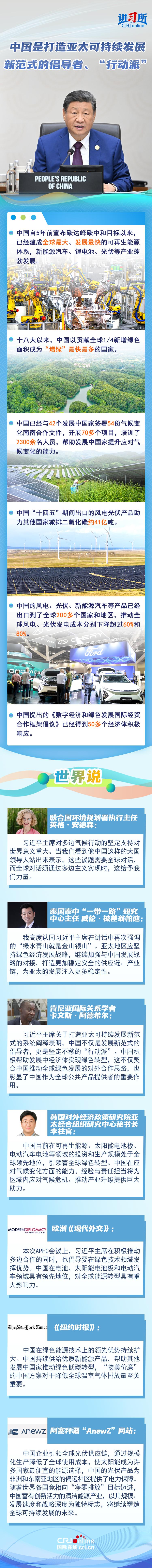 “我们要本着对子孙后代负责的态度,加强各经济体绿色发展战略对接,促进优质绿色技术和产品自由流通,加快推动发展方式绿色低碳转型,积极应对气候变化。”11月1日,中国国家主席习近平在亚太经合组织第三十二次领导人非正式会议第二阶段会议讲话中提出,要坚持绿色低碳,打造亚太可持续发展新范式。