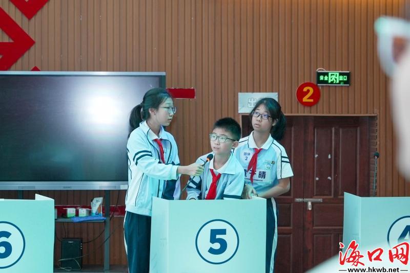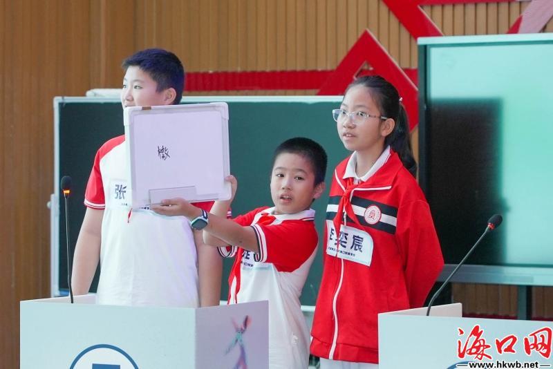 团体赛决赛现场,海口市滨海第九小学美丽沙分校代表队沉着冷静,队员间彼此呼应,将团队协作的魅力展现得淋漓尽致。队员们介绍,他们取胜的关键在于清晰的分工与高效的协作。“虽然拼字环节一上来有点紧张,但我们很快找到了节奏。特别是到成语部分,心态和发挥就慢慢地稳住了。”队员黄于晴分享道。