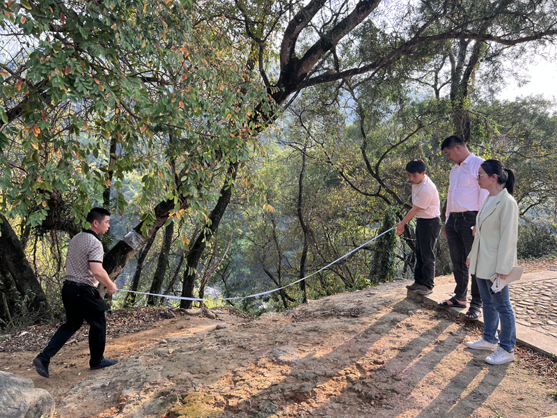 图为市纪委监委下派至美亭村第一书记黄华容与村干部、村民一起测量拟建兴仁湾停车场配套休息亭四至范围及面积(颜晓枫 摄)