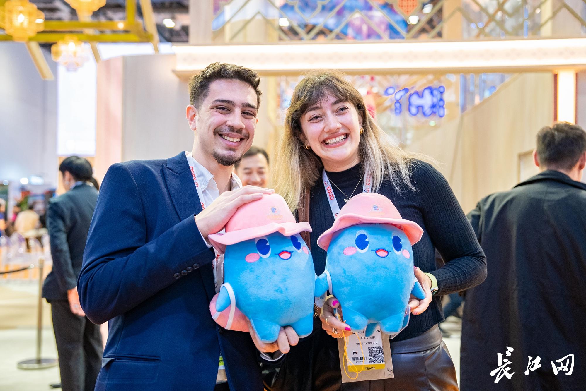 在伦敦世界旅游交易会上,拿到国际版《湖北·长江旅游护照》的外国嘉宾与江豚“豚宝”合影。 彭泉锦 摄