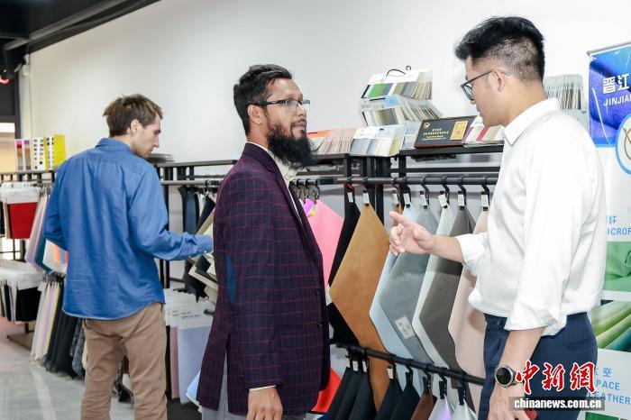 11月6日,海外采购商在晋江国际鞋纺城走访商家、看样交流。晋江国际鞋纺城供图