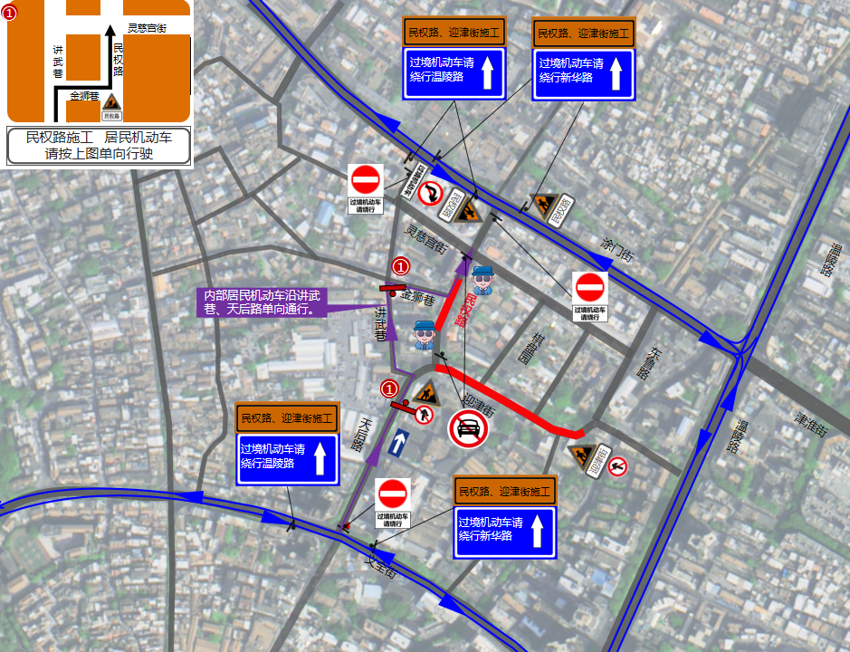 限制措施:禁止过境机动车通行(行人、非机动车仍可通行,内部居民机动车可从金狮巷单向驶入民权路。)