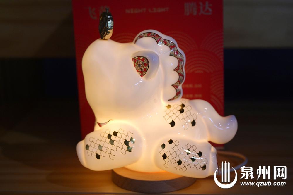 德化嵩悦堂则延续其“实用+趣味”的创作路线,今年以《山海经》瑞兽“飞黄”为灵感,推出一款马形小夜灯。马身饰以龙鳞纹样,呼应“龙马精神”的奋发意象;头顶嵌有一枚复刻自宋代古币样式的“马钱”,镌刻“飞黄腾达”吉语,轻轻一拨即可转动,暗合“马上转(赚)钱”的谐趣妙意。总经理毛录全还展示了另一套“显眼包”萌马手绘生肖杯,“丑萌造型搭配俏皮文案,精准捕捉年轻人的喜好,线上反响非常热烈。”