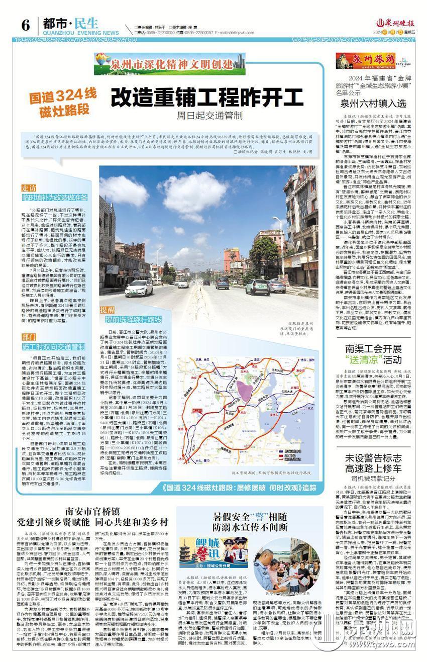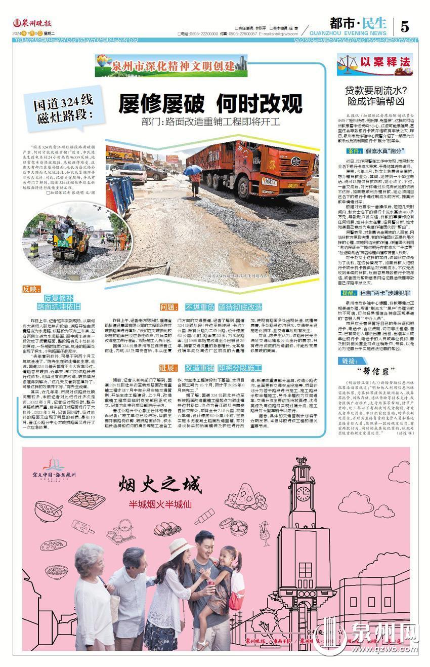 国道324线是泉州市区连接晋江磁灶、内坑以及南安官桥、水头往厦门方向的交通要道。据测算,磁灶路段日车流量近4万辆,由于路面运营已超出设计使用年限及重载车辆占比大,导致路面破损等问题较多,影响交通安全。