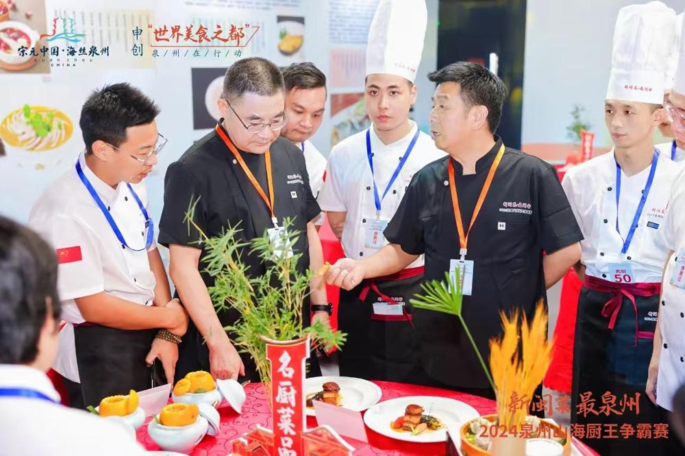 2024泉州山海厨王争霸赛现场,裁判组与参赛选手交流菜品。 (泉州味道 供图)