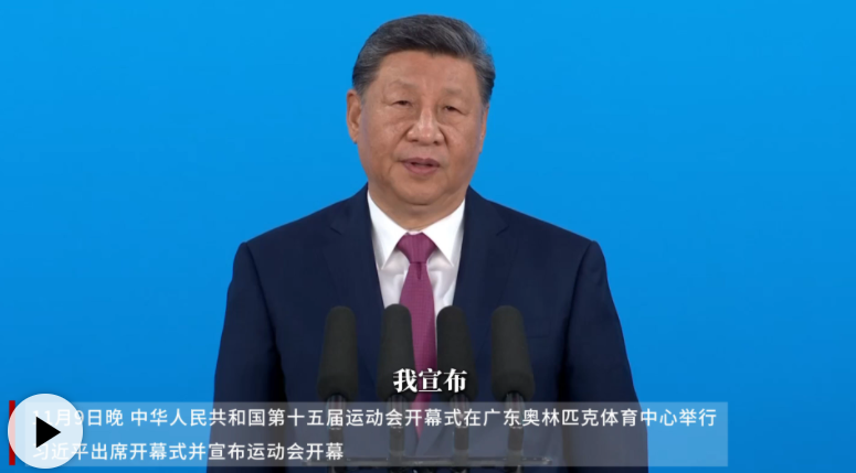 11月9日晚,中华人民共和国第十五届运动会在广东省广州市隆重开幕。中共中央总书记、国家主席、中央军委主席习近平出席开幕式并宣布运动会开幕。