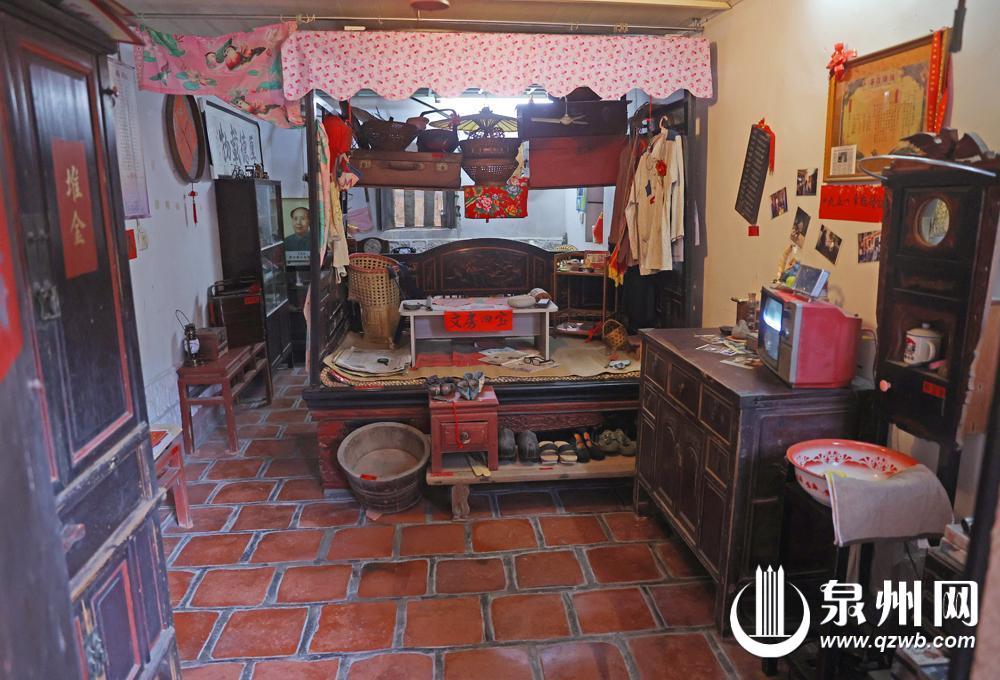 大厅左手边的主人卧室,门口依旧挂着印着红双喜的席帘。尤先生介绍,2000年以前,很多地方婚房门口都挂着帘子,不同时代不同材质,挡住喜气不外泄。