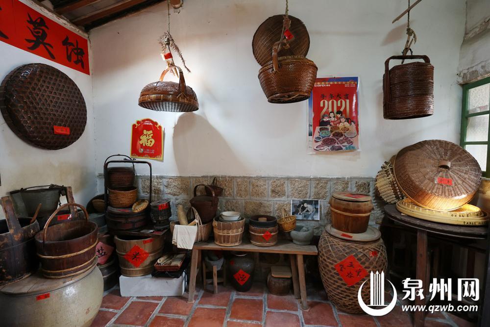 不大的厨房里,有米缸、水缸、油缸、洗碗桶、蜂窝煤、碗菜桌等,大多数按二十世纪五六十年代时的厨房布置摆放。进入厨房,右侧天花板上吊着三个篮子。“两个是菜篮子,以前没有冰箱,没有柜子,吃剩的好料就是这么吊在天花板上,绳子上还绑着一些从山上拔来的刺,这样老鼠就进不到篮子里了。右边这个是神篮,祭拜用的,1938年到现在了。”尤先生介绍,祭祀的篮子是从南安康美一个80多岁的老人家那里收来的。为了保护篮子,他给篮子上了一层漆。