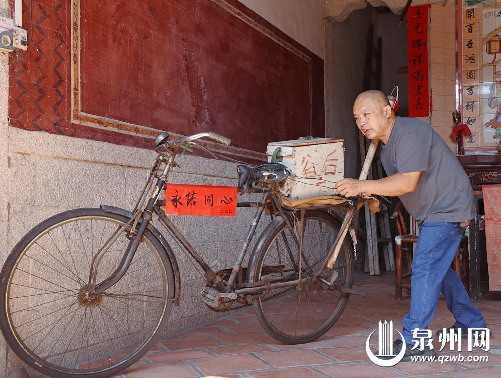 尤铭沧模仿以前车后座载重物骑不动时,站在后座旁边,顶着杆推车,再用车把上的绳子控制车的方向。