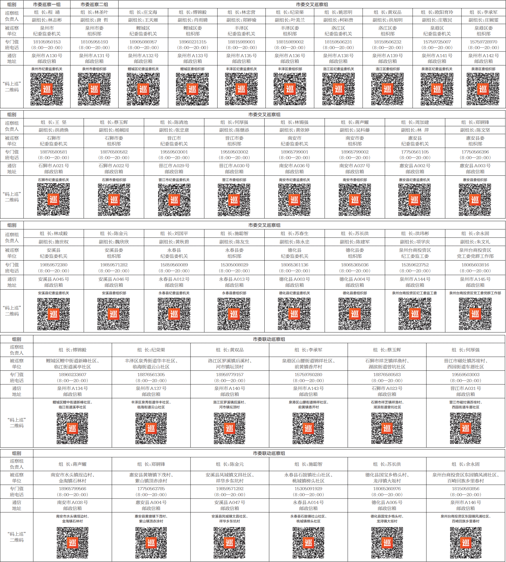 泉州网11月15日讯 (融媒体记者许雅玲)根据党中央关于巡视巡察决策部署及省委、市委工作要求,经市委巡察工作领导小组研究决定,日前,市委巡察组对市纪委监委机关、市委组织部开展常规巡察;对11个县(市、区)纪委监委机关、党委组织部门和泉州台商投资区纪工委监工委、党工委党群工作部开展“提级+交叉”巡察,巡察时间30天左右。同时,对部分村(社区)开展提级巡察“回头看”,巡察时间1周左右。