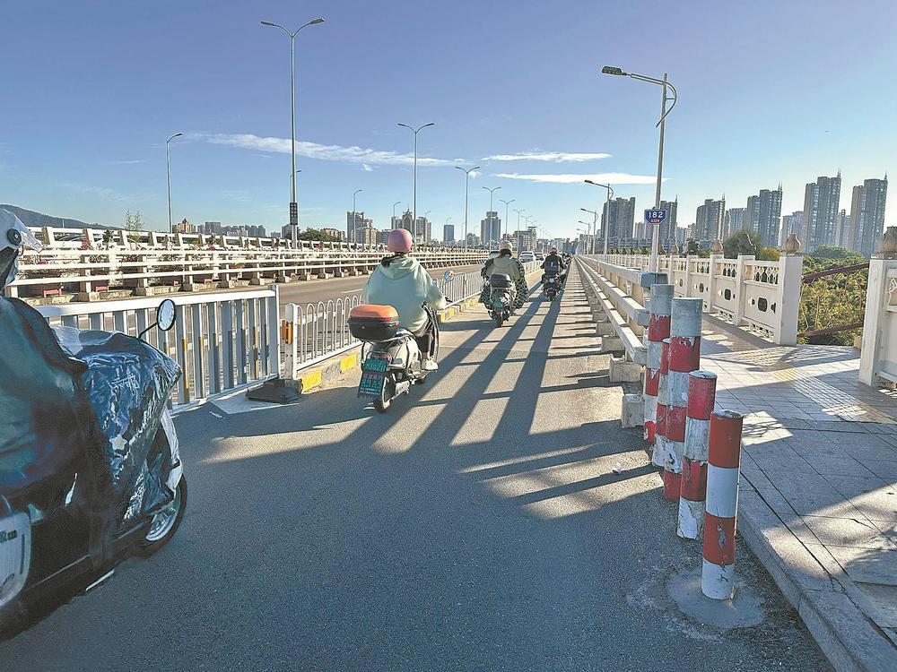 泉州网11月17日讯 (融媒体记者张小玲 文/图)在“总编接线”期间,网友赵先生在“96339记者热线”微信公众号上留言:泉州大桥(晋江往泉州市区方向)非机动车道和人行道之间的护栏又高又壮,高峰期电动车并行时,车把容易剐蹭到护栏,为此建议将此护栏拆掉或者更换为低一点的简易护栏。