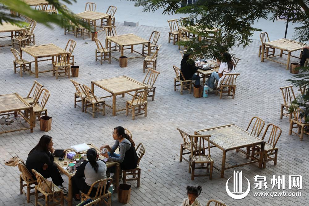步入其中,仿佛穿越时光隧道:开阔的广场上,数十张竹桌竹凳整齐排列,市民游客围坐品茶,品尝从“绿皮中巴车”造型餐车中端出来的古早味美食。榕树下,孩子们追逐打闹,笑声阵阵;竹编摇椅上,居民闲话家常;复古路牌和小卖部等布景前,不少人忙着拍照留念,定格美好瞬间。室内空间同样精心规划,一楼、二楼被打造为茶馆和复古主题区域,三楼则被改造为多功能教室,定期开展非遗手工课等特色活动,实现了空间的高效复合利用。