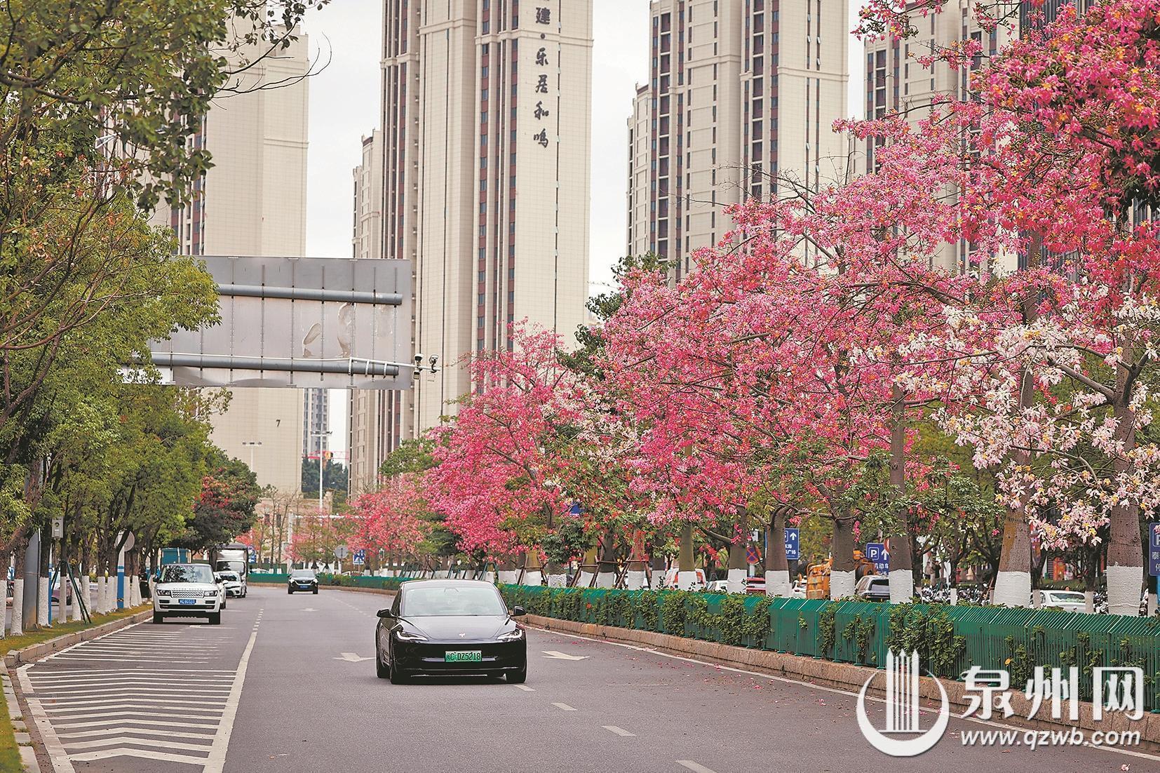 连日来,市区大兴街一整排美丽异木棉进入盛花期,满树粉黛如云似霞,为道路披上浪漫“粉装”。据悉,每年11月至12月是它的最佳观赏期,市区芳草园、东湖公园、刺桐路等多处地方也能邂逅这份初冬限定浪漫。(融媒体记者陈晓东 摄)