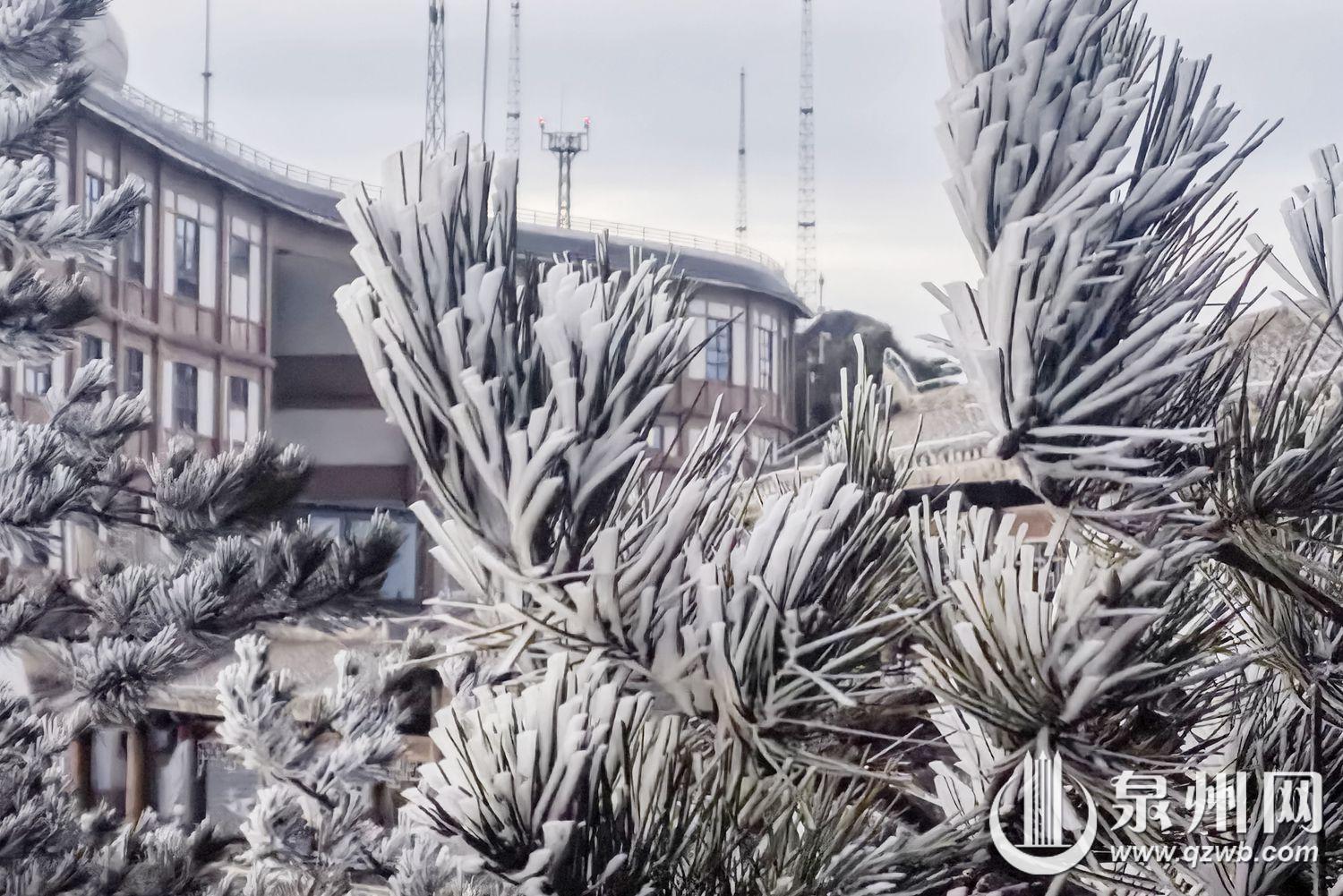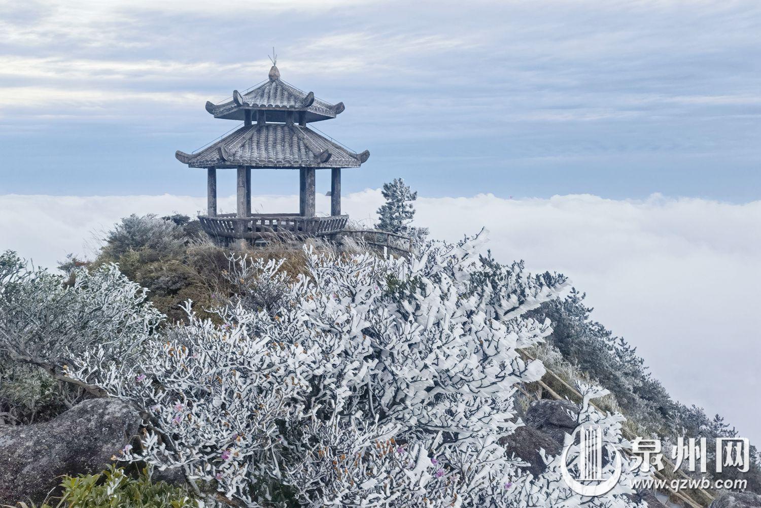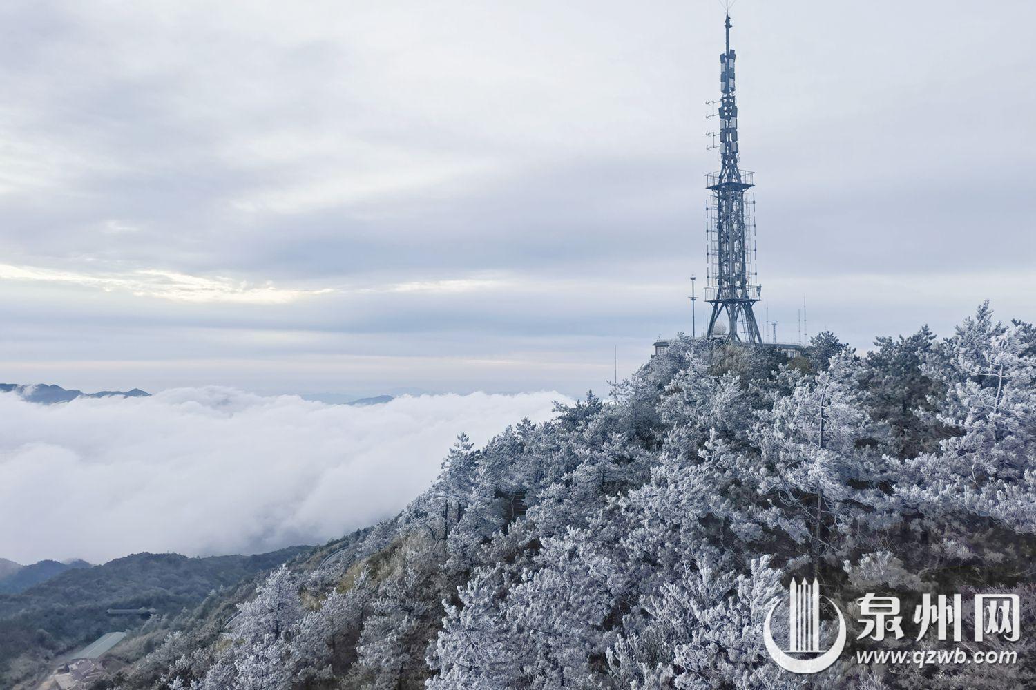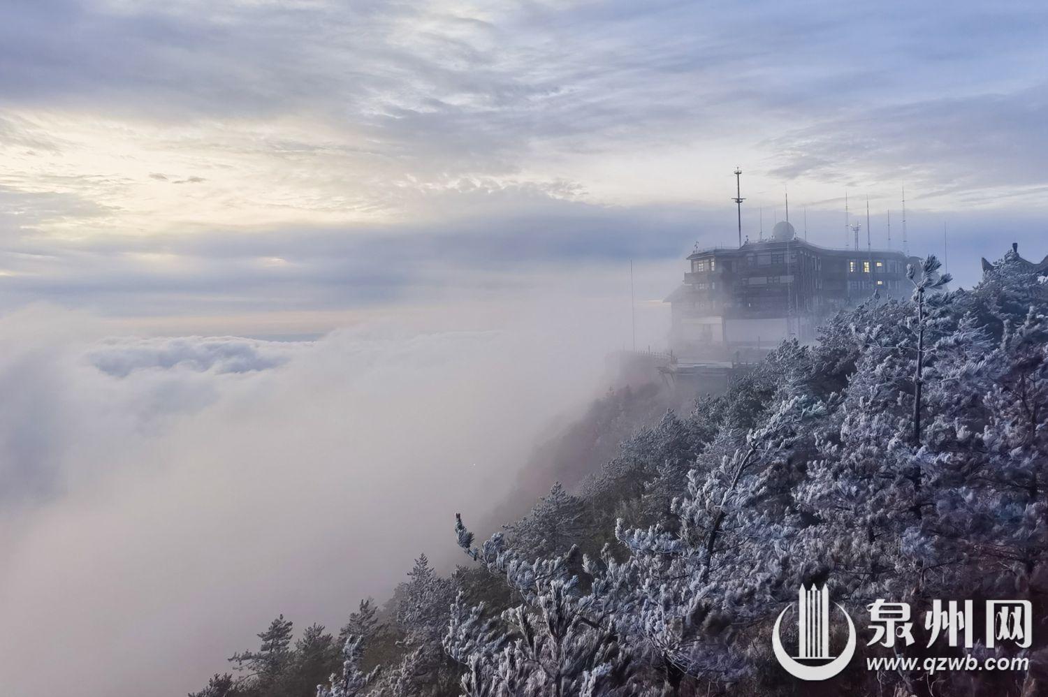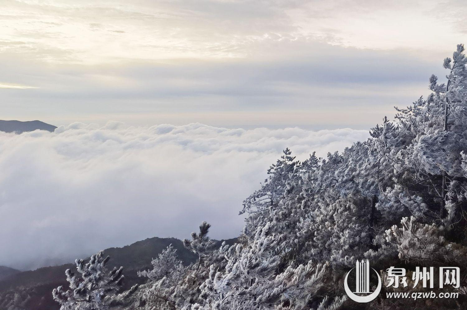 11月19日,受强冷空气影响,泉州市德化县九仙山迎来入冬以来首场雾凇,恰逢云海同步登场,雾凇映云海的奇景令人赞叹。一夜之间,山间林木换上银装,清晨的山头宛如冰雪童话世界。寒风中,雾凇在枝头摇曳,松针裹着晶莹的冰壳,灌木枝条凝着洁白霜花,洁白的云海在山间流动,恰似仙境,美轮美奂。(通讯员赖建明 融媒体记者陈起拓 图/文)