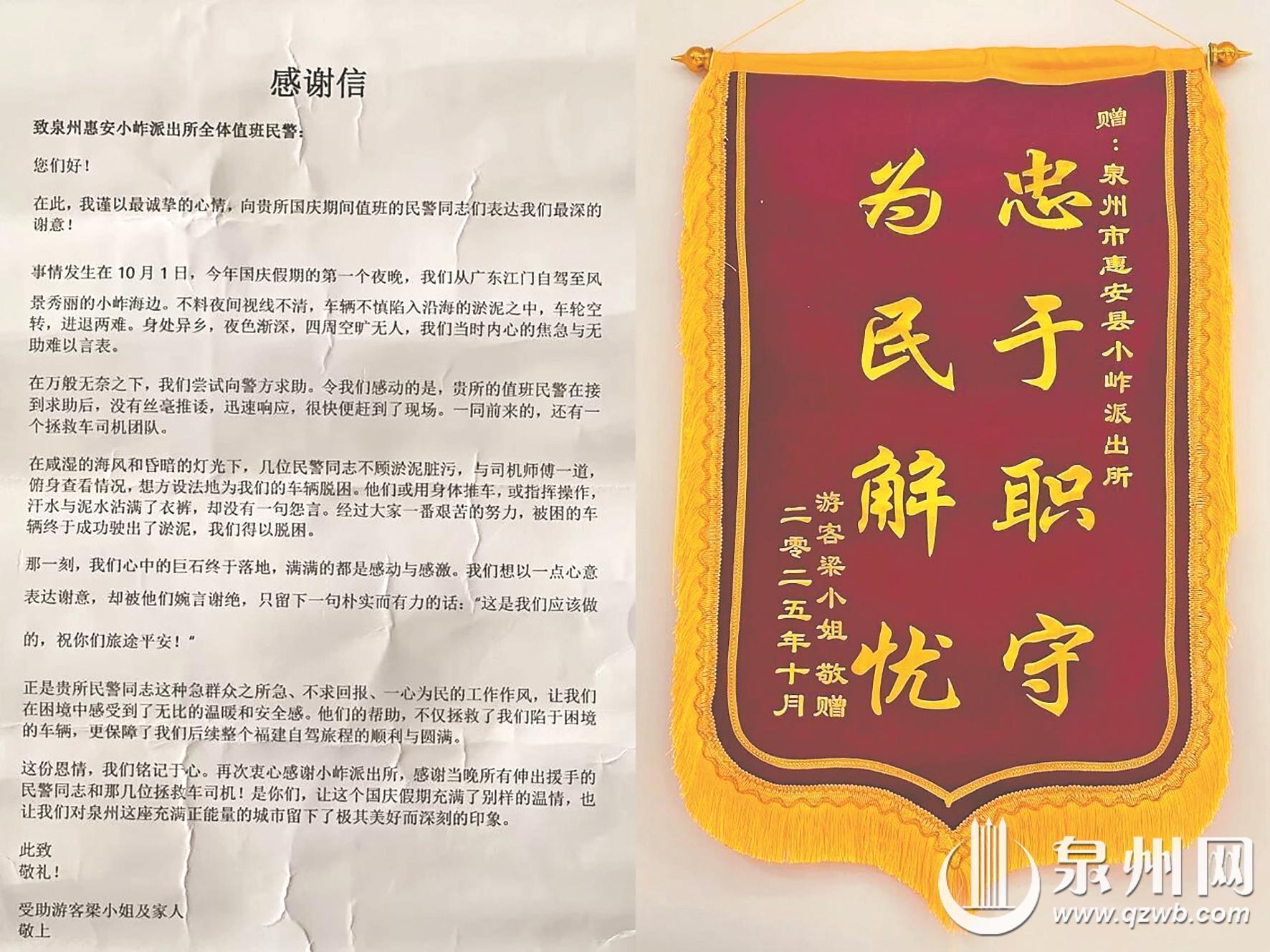 “在我们急需帮助的时候,民警们不惧脏累、全力救援,让我们整个福建之旅倍感温暖。”梁女士说,回到广东后,她始终铭记着这份真情,特意定制锦旗、撰写感谢信寄往小岞派出所以表谢意。