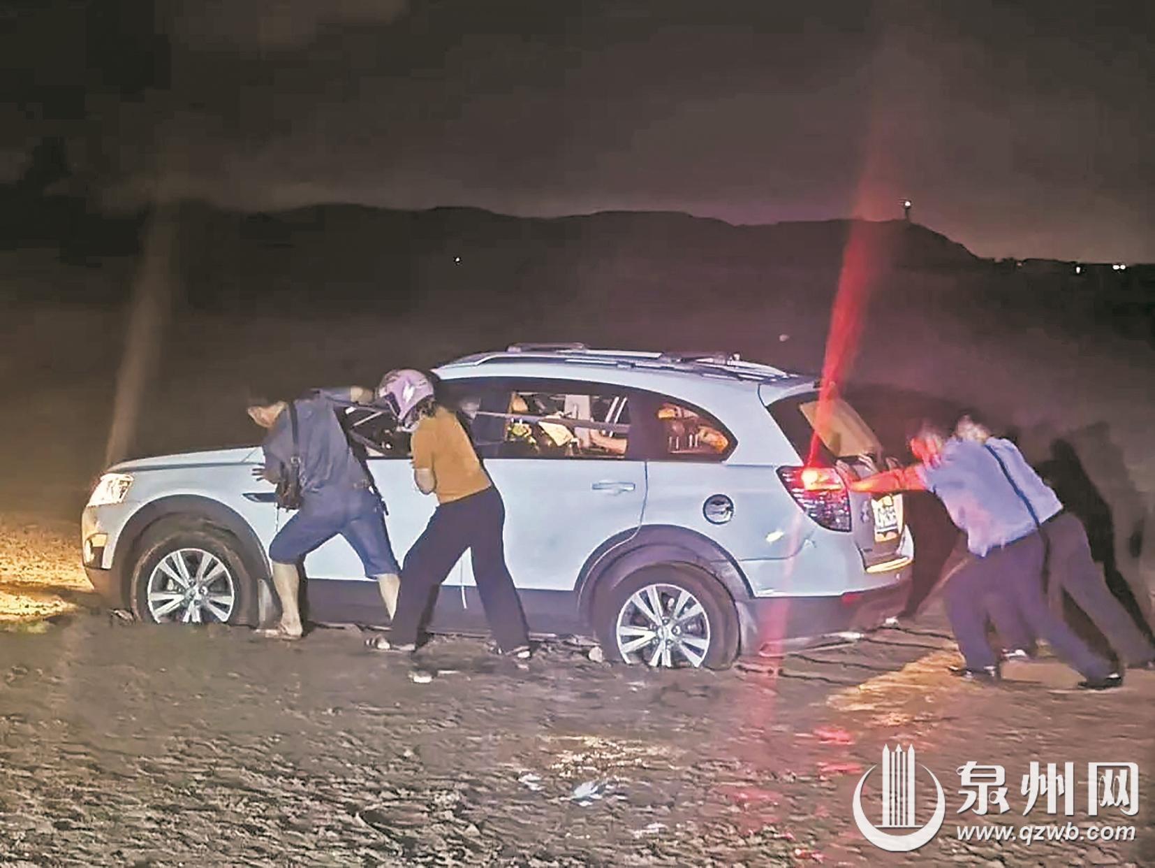 梁女士的谢意把民警们的回忆拉回到国庆假期。10月1日21时许,小岞派出所接到紧急求助,来自广东江门的游客梁女士一家自驾至小岞镇沿海路段时,车辆不慎陷入海边淤泥,随着车轮空转,车身持续下陷,情况十分危急。接警后,值班民警蔡扶超迅速带领辅警携带救援装备,协调专业救援车辆一同赶赴现场。