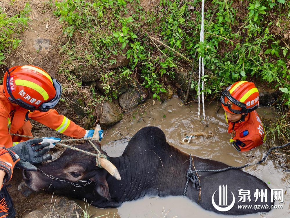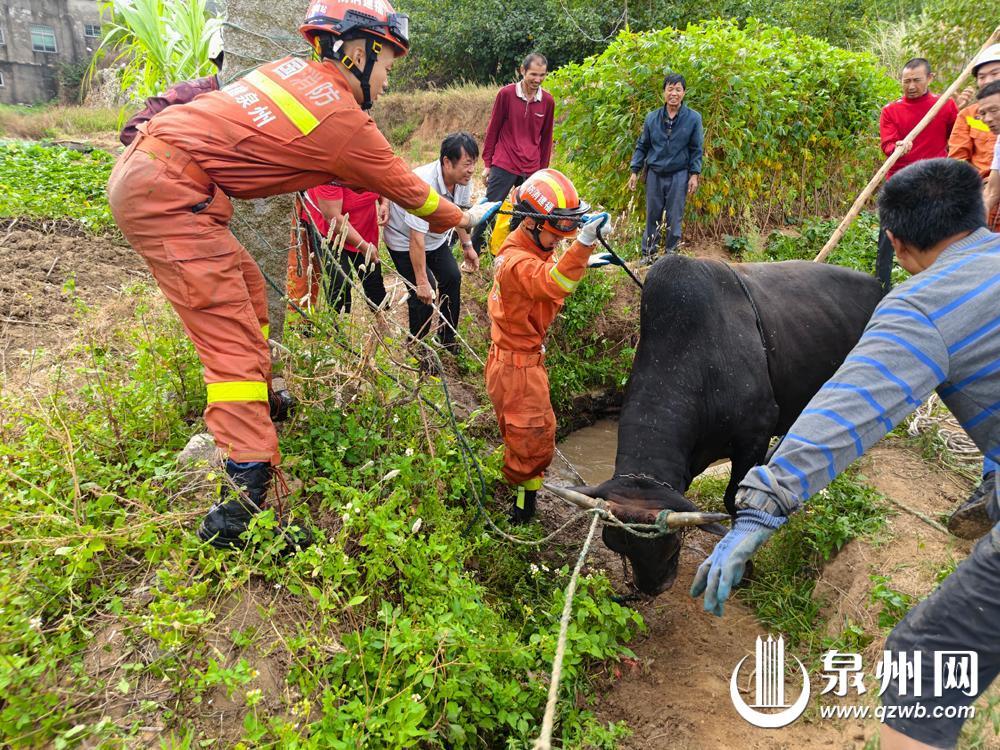泉州网11月21日讯(融媒体记者傅恒 通讯员庄伟斌 郭云霞 文/图)11月17日上午11时许,泉港区前黄镇坑边村,一头耕牛在水坑边饮水时不慎失足滑落,因水坑淤泥堆积、墙体湿滑无法自行脱困,牛主人焦急地报警求助。接警后,泉港区前黄消防救援站迅速调配力量赶赴现场处置。