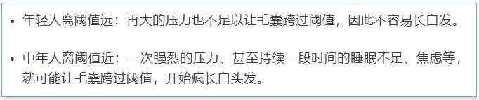 但如果毛囊长期停在阈值之外,例如持续多年压力、年龄进一步增长,毛囊就会“固化”为白发状态,不再逆转。