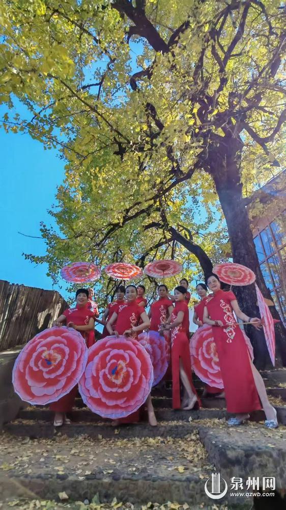 活动当天,十多位表演者身着红、藏青、白等各色精致旗袍,手持花伞、古扇,迈着从容优雅的步履,沿着银杏树下的石阶缓缓前行。他们的身影与漫天金黄的银杏叶相映成趣,在阳光的映照下熠熠生辉,构成一幅穿越时空的诗意画卷,引得慕名而来的游客纷纷驻足观赏,快门声此起彼伏。