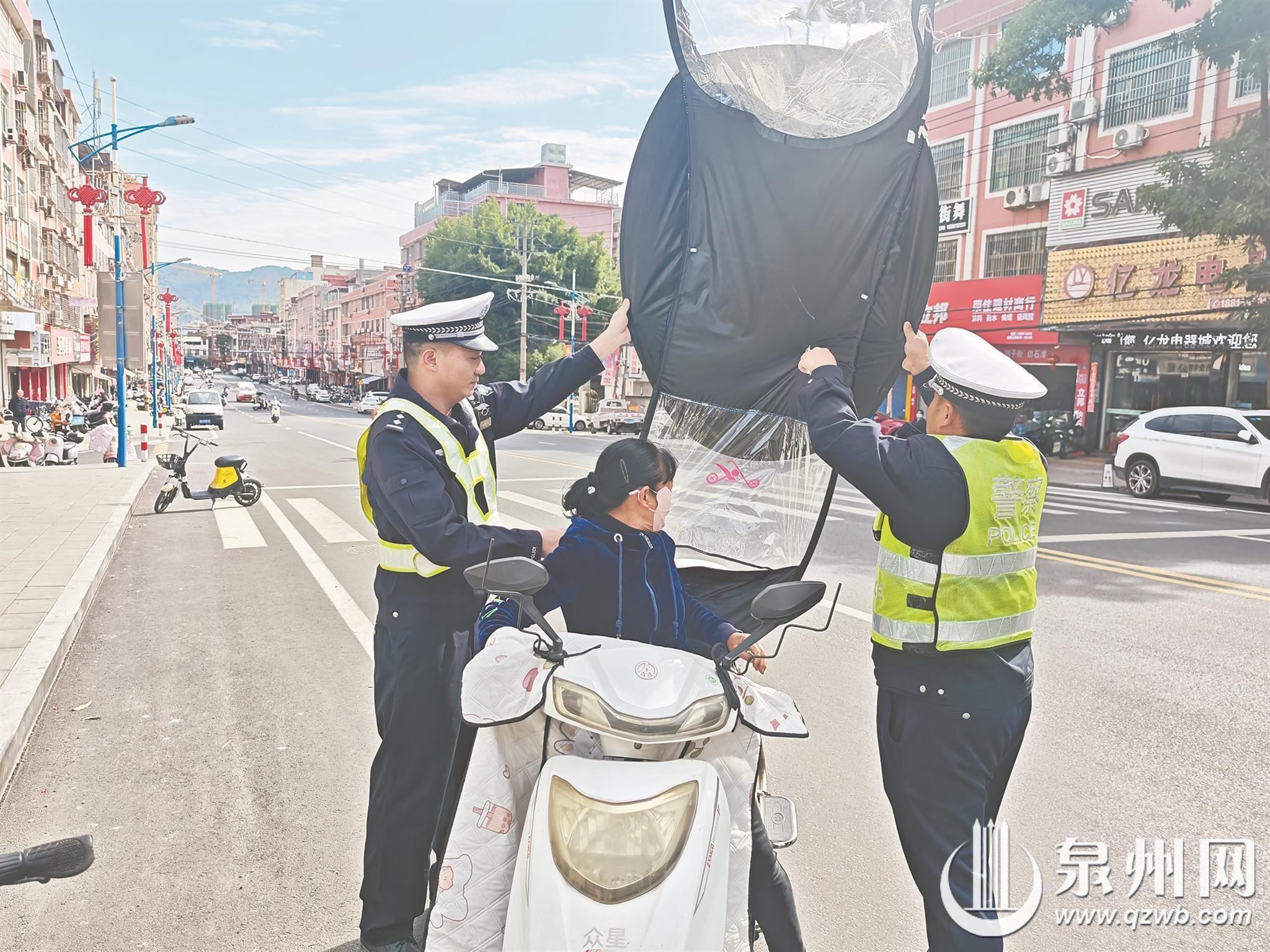 泉州网11月27日讯 (融媒体记者林志安 通讯员陈泉发 文/图)随着气温下降,不少市民在骑乘二轮车时增添防风防寒装备,这一现象在海拔相对较高的山区乡镇尤为明显。然而,在二轮车上加装遮阳伞(雨篷)存在严重安全隐患。近日,安溪交警部门在湖头镇开展专项整治行动,严查并及时消除此类安全隐患。