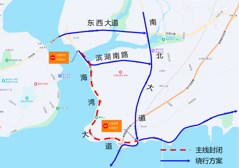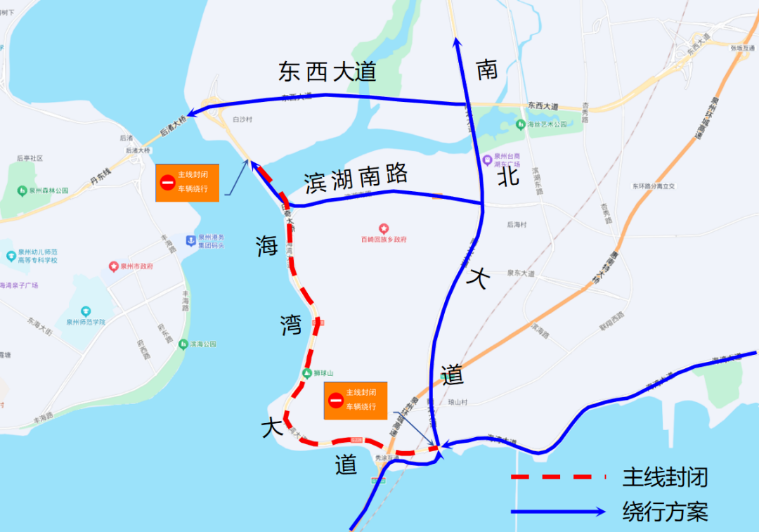 届时,欲途经该路段者可采取以下绕行措施:从泉州市区、晋江、南安往崇武方向过境交通的,可由“境内东西大道→南北大道→海湾大道或海湾大道→滨湖南路→南北大道→海湾大道”绕行;从崇武、泉州东高速口往泉州市区、晋江、南安方向过境交通的,可由“境内海湾大道→南北大道→东西大道(或滨湖南路)”绕行至后渚大桥。