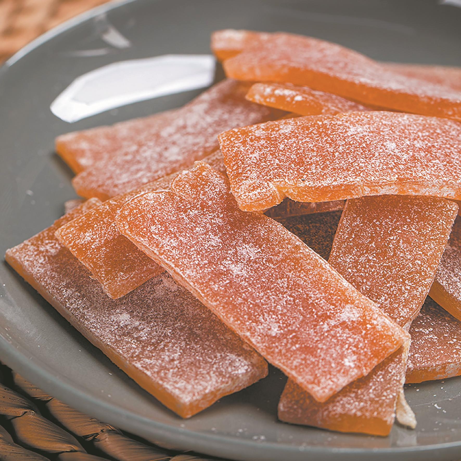 姜丝糖,是一款地域特色美食,永春、德化一带作为逢年过节的茶配。制作时,先将姜片切成均匀细丝,放入水中焯烫两三遍去除部分辛辣味后,再放入锅中与冰糖或白砂糖一同翻炒,直至食材变得干燥、表面呈现翻砂状态即可。姜丝糖口感香甜,带着姜的清香,适合当做日常茶配、小食。