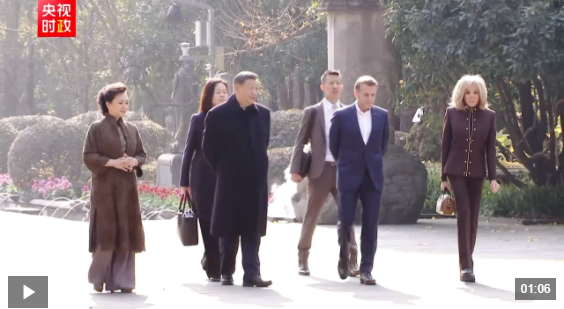 初冬的都江堰,苍山掩翠。马克龙夫妇抵达时,受到习近平和彭丽媛热情迎接。两国元首夫妇沿堰功道边走边谈。习近平介绍都江堰历史和意义,指出都江堰水利工程是全世界迄今唯一仍在使用的古代水利工程,也是人类与自然和谐共生最早的成功实践之一,修建过程充分反映了中华民族自强不息、不畏艰难、勇于开拓的精神。两国元首夫妇落座怀古亭,临水品茗,纵论天下。