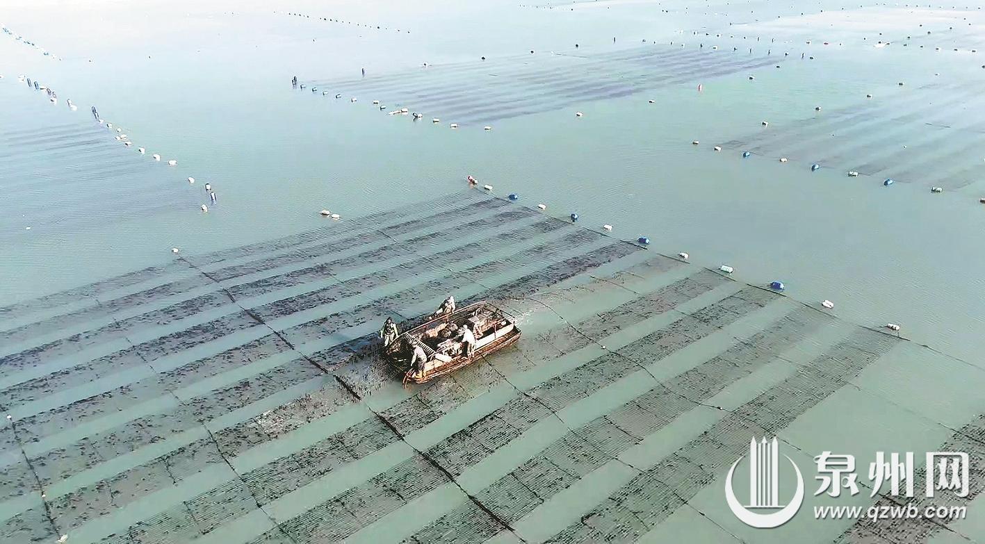 泉州网12月8日讯(融媒体记者张雯 通讯员刘晓明 陈晓婷 刘诗颖 文/图)眼下正是“头水”紫菜收成季。连日来,泉港区峰尾镇海域约4000亩的“头水”紫菜进入集中采收期。养殖户趁着晴好天气,驾驶采收船穿梭在连绵的“海上阡陌”之间,熟练地剪取、装船、拖运,一幅丰收画卷在蔚蓝的海面上徐徐展开。