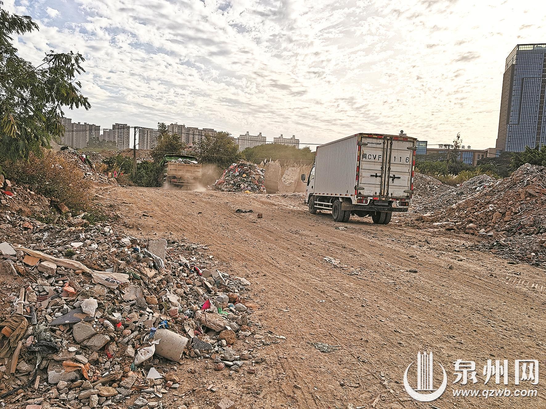 现场 车辆碾过扬起粉尘 各类垃圾堆积成山