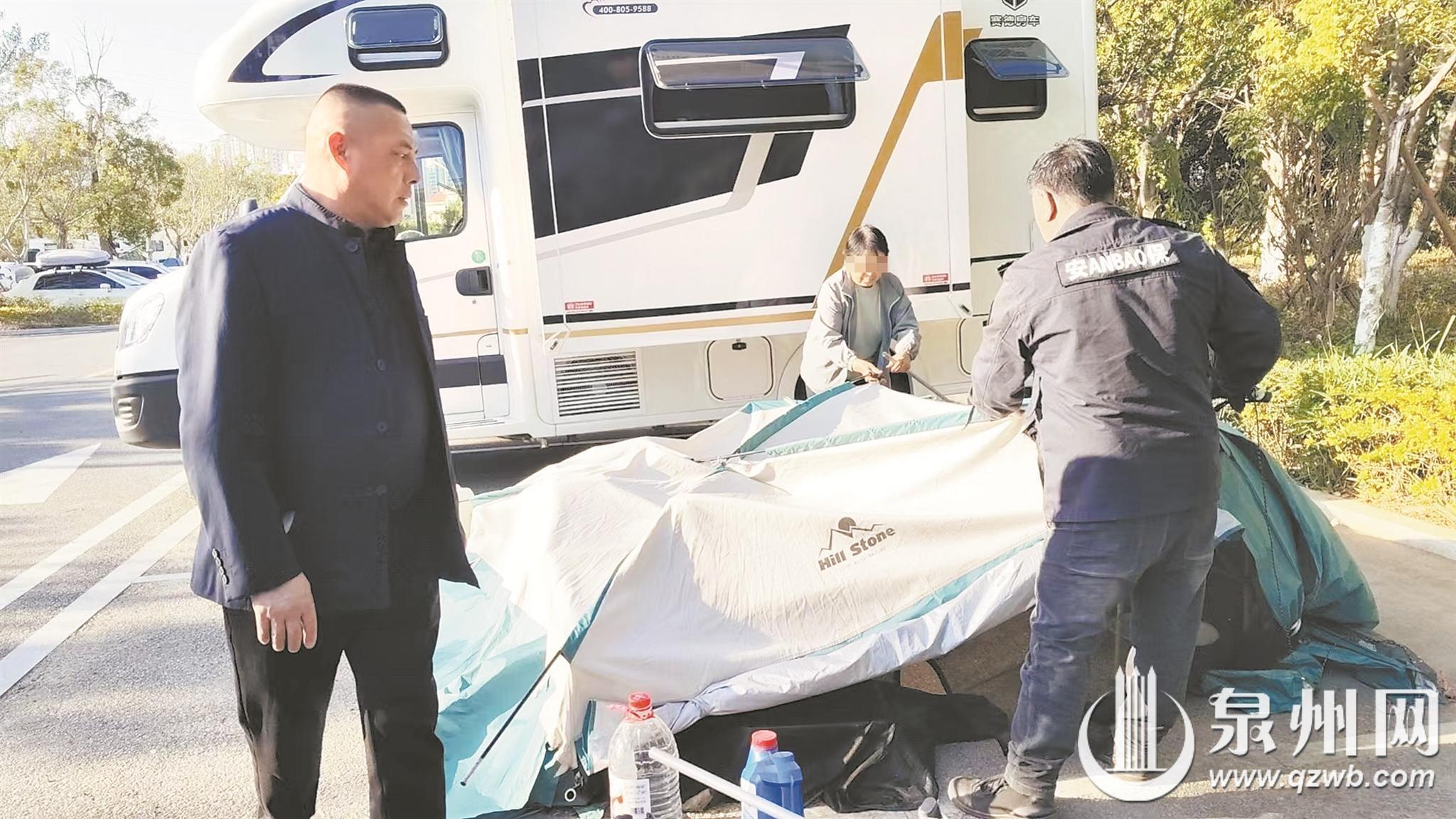 “您好,公共车位是供车辆停放的,您搭帐篷占用了两个车位,麻烦收拢一下,让出一个停车位,谢谢。”当天,石狮市城市物业管理公司工作人员李先生带着2名保安对房车占位的车主逐一进行劝导。吉林车主矫先生与谷女士夫妇当即配合拆卸帐篷、收纳至车内。“石狮是个好地方,我们会遵守规则,不给大家添麻烦。”谷女士说道。