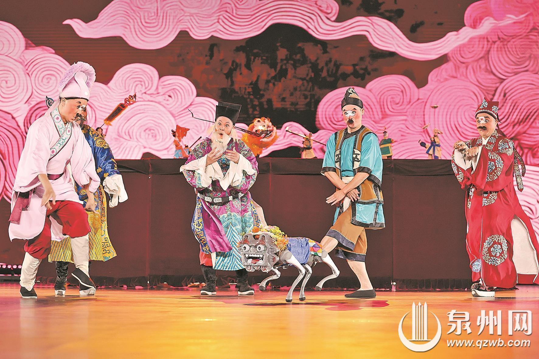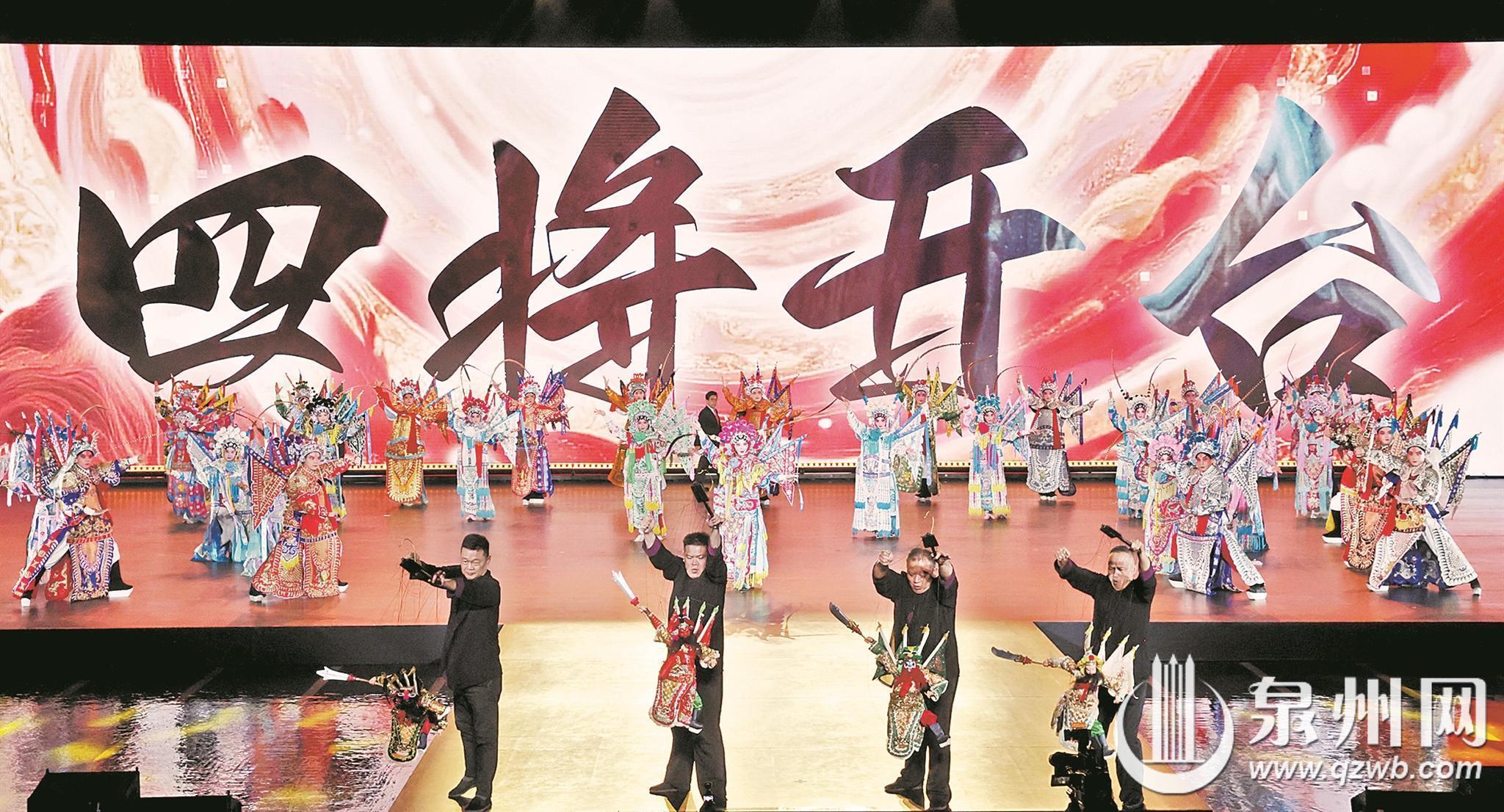 在多元文化的交响之后,舞台回归本土戏曲的深厚底蕴。非遗串烧《戏韵留声》章节中,梨园戏的婉转细腻、高甲戏的诙谐热闹、打城戏的神秘奇诡、提线木偶的栩栩如生,多种非遗剧种同台竞艺,却又和谐统一。传统戏台的程式化表演与现代舞台的视觉科技相互映衬,碰撞出属于这个时代的视觉诗篇,展现了泉州作为“戏窝子”戏曲生态的丰富性与包容性。