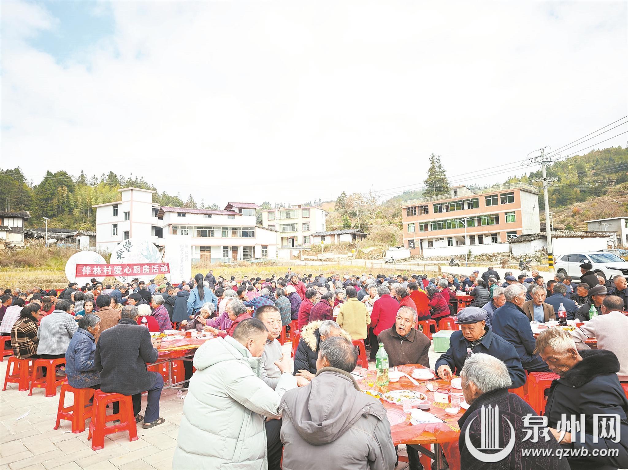 泉州网12月15日讯(融媒体记者陈小芬 通讯员吴有森 林晓勋 文/图)“开席喽!”一声响亮的吆喝伴随着饭菜的香气,从德化县上涌镇伴林村的宁美堂广场飘散开来。12月9日这天,广场上人头攒动,笑声、寒暄声、锅碗瓢盆碰撞声,汇成了一曲热腾腾的“乡村交响乐”。村里新办的“爱心厨房”首次敬老午餐热闹开席,300余名60周岁及以上老人欢聚一堂,共享温馨“幸福餐”。