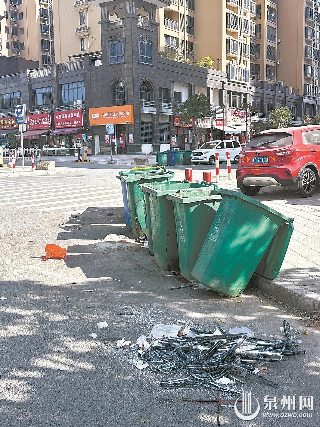 泉州网12月24日讯(融媒体记者刘燕婷 文/图)近日,泉州市丰泽区乐居兰苑小区的业主吴先生致电96339反映,他们小区与南安市丰州镇天元未来城小区之间的支纬一路,有多个垃圾桶扎堆摆放在路口两侧,成了垃圾投放点,影响道路卫生环境。两个小区的居民进出都需经过该路口,希望部门重新规划垃圾桶的设置。