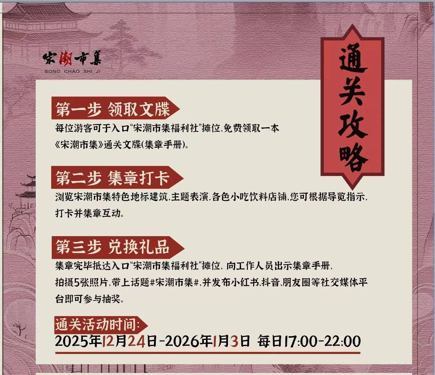 市集还设置宋潮“集章闯关”新玩法,即日起至2026年1月3日每日17时至22时举行。市民可凭借通关文牒,化身宋朝市民踏入《清明上河图》的烟火人间,在坊市间经营、贸易、竞技,亲手点亮这座不夜之城,体验千年前的风雅与繁华。活动精心设置了浔海乐游、蚝杰壮志、石狮古早味、人间海鲜串烧、来旺良品堂、榕树林大油边6个摊位打卡点以及蹴鞠、投壶、捶丸、丢沙包4个互动小游戏,完成打卡即可盖章,抽取幸运大奖。