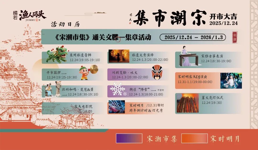 作为海上丝绸之路重要起点城市,泉州曾以“东方第一大港”的盛景惊艳世界。宋元时期,这里“市井十洲城”“涨海声中万国商”,夜幕下的刺桐城更是灯火如昼。如今,这份繁华将在丰泽蟳埔渔人码头重现——12月24日晚6点,宋潮市集邀您共赴一场跨越千年的宋式狂欢!