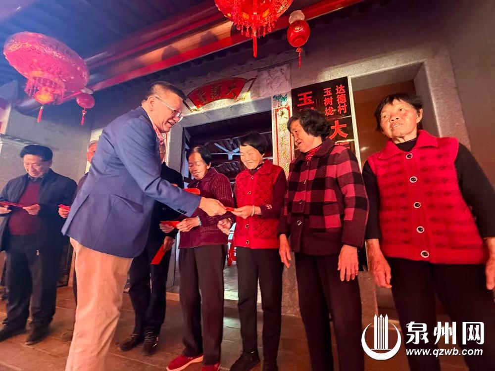 泉州网12月26日讯(融媒体记者 陈玲红 实习生 吴滢君 彭佳瑶 文/图)又到一年岁末,永春县达埔镇达德村叶氏祠堂门口张灯结彩,一派喜庆。过去每年的这个时候,达德村80岁以上老人便能收到马来西亚侨胞寄来的新年红包。今年侨胞们心意加码,不只发红包,还宴请乡亲,千余名叶氏族人与百余名侨胞欢聚一堂,共迎新年。