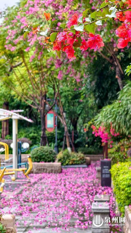 泉州网12月27日讯 清晨推开窗,寒意扑面——近日,在一场突如其来的冷雨里,泉州变成了剔透的“冷藏室”。可寒冷从来封不住美。在市区东湖公园两处健身苑,静静铺满了被夜雨打落的羊蹄甲花瓣。水红色的花瓣沾着雨珠,层层叠叠,柔软地覆盖住小径与石阶,像大自然悄悄铺开的一张巨幅地毯。