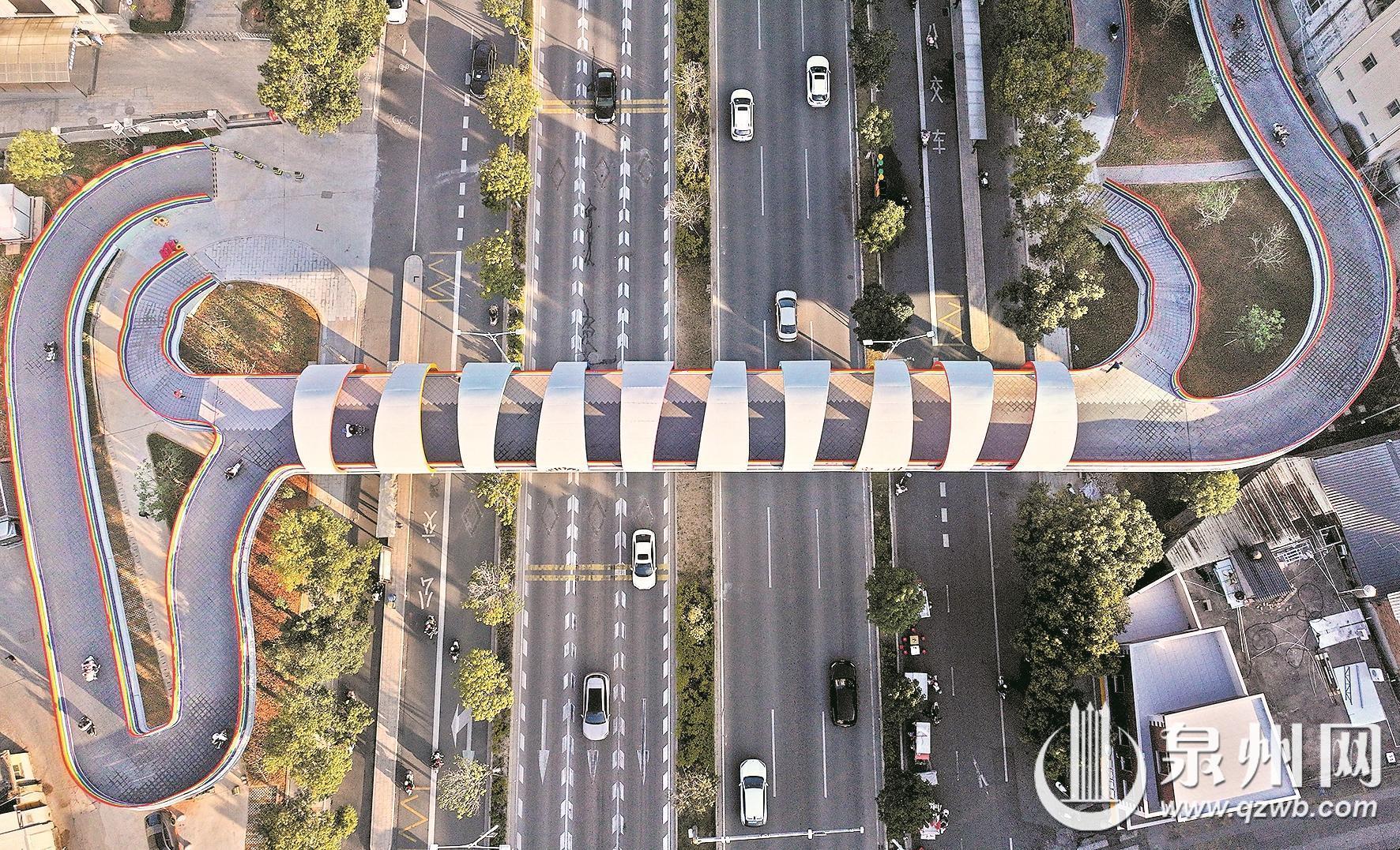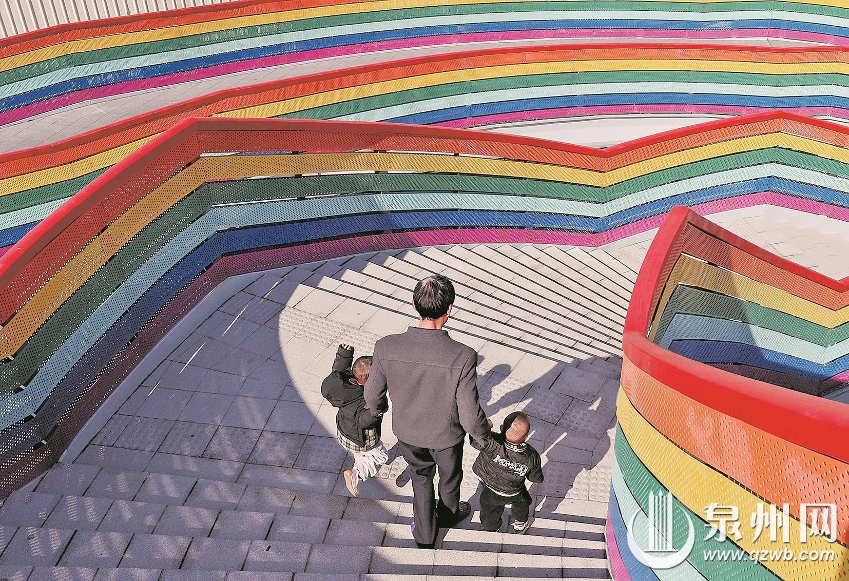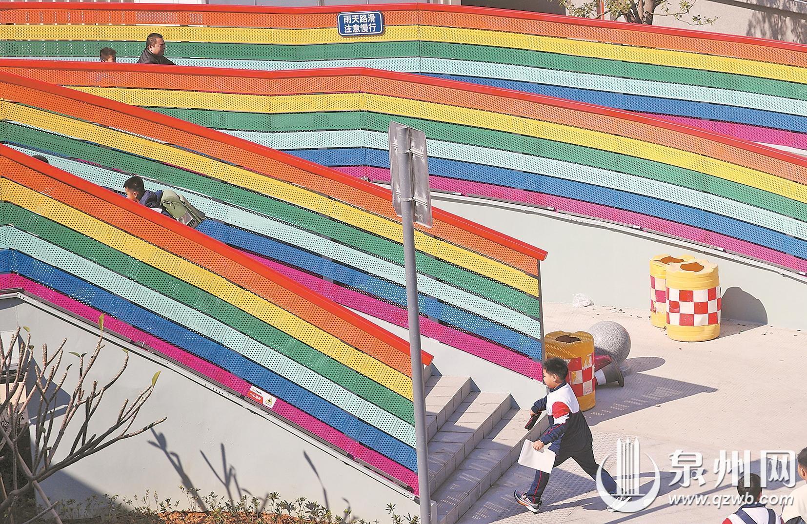 清晨的泉州市区普贤路,群石实验小学门口渐渐热闹起来。与以往不同的是,如今家长们送孩子上学不再横穿车流量密集的马路,而是踏着色彩斑斓的梯道走上过街天桥——这座被市民亲切称为“彩虹天桥”的设施近日开放试通行,以安全与颜值兼具的设计赢得师生和家长一致点赞。