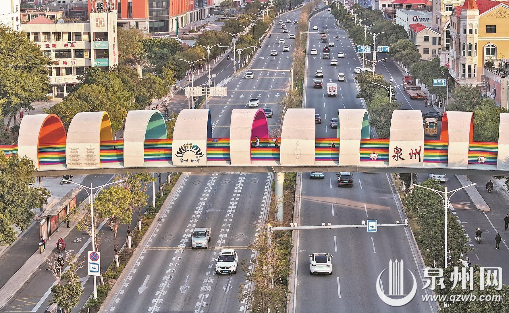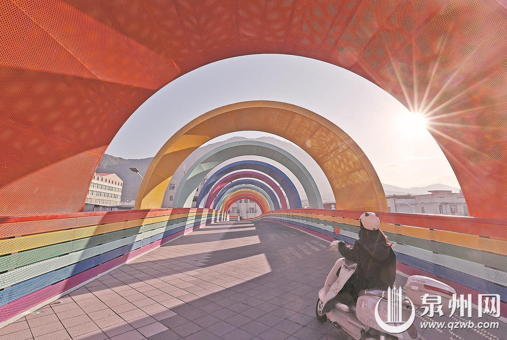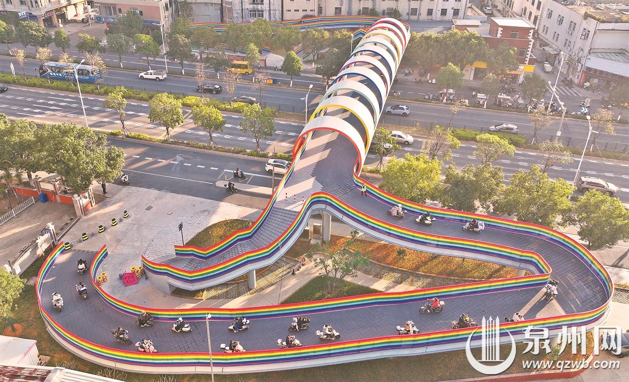清晨的泉州市区普贤路,群石实验小学门口渐渐热闹起来。与以往不同的是,如今家长们送孩子上学不再横穿车流量密集的马路,而是踏着色彩斑斓的梯道走上过街天桥——这座被市民亲切称为“彩虹天桥”的设施近日开放试通行,以安全与颜值兼具的设计赢得师生和家长一致点赞。