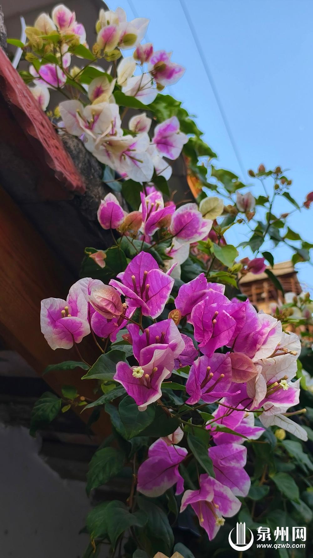 泉州网1月6日讯 近日,寒潮虽至,泉州古城却处处洋溢着盎然生机。在多处街巷、庭院墙角,一簇簇三角梅正迎着冬日暖阳绚烂开放。深红、浅粉、明黄、雪白……各色花朵缀满枝头,宛如被打翻的调色盘,为古朴的砖瓦与巷道点缀上亮丽的色彩,吸引众多市民游客驻足拍照。