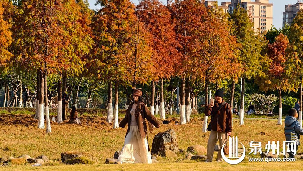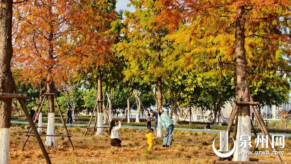 晋江南岸生态公园里,落羽杉晕染金黄与橙红,与澄澈蓝天相映,构成暖色调画卷。市民纷纷追光而来,以杉林为背景拍摄写真,定格美好瞬间;孩童在枯草地上追光奔跑,笑声随风吹散林间,尽显童真。
