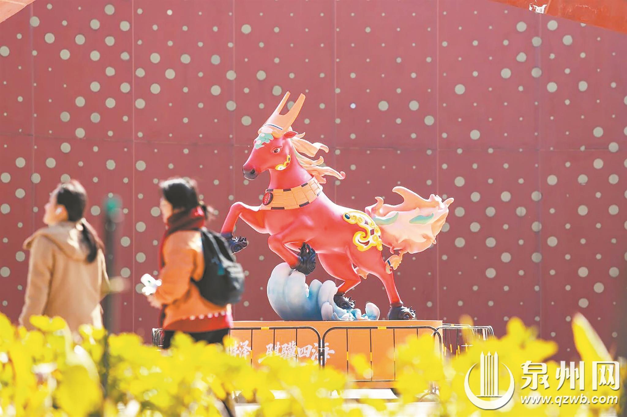 泉州网1月12日讯(融媒体记者龚翠玲 通讯员陈庚嘉 文/图)近日,“这YOUNG的丰泽 骐骥四海”马年专属IP装置主马——“骐骥泽泽”亮相东海四朵金花广场。这座高达3.7米的艺术装置由丰泽区委宣传部联合源之宇宙(福建)公司设计,以闽南红为主色,头顶燕尾脊、身披花砖纹脚踏海丝浪、尾曳科技焰,既复古又新潮,仿佛从千年海丝故事中奔腾而来,立于四朵金花广场中央成为广场上令人瞩目的打卡焦点。