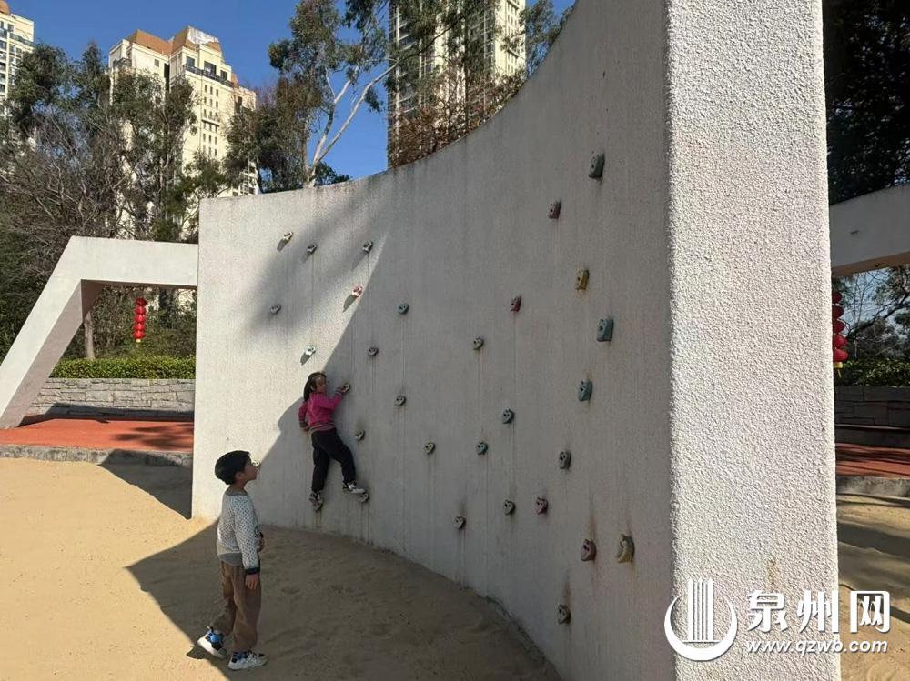 潘山公园的攀岩墙和沙坑是小朋友的最爱