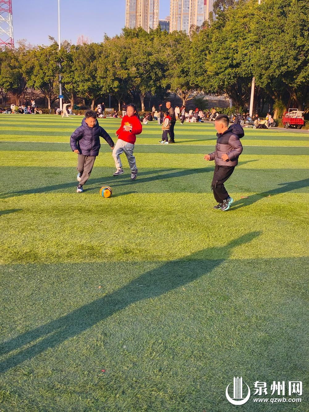 周末,孩子们在北滨江公园(浦西园)踢球,享受冬日暖阳。 (王世阳 摄)