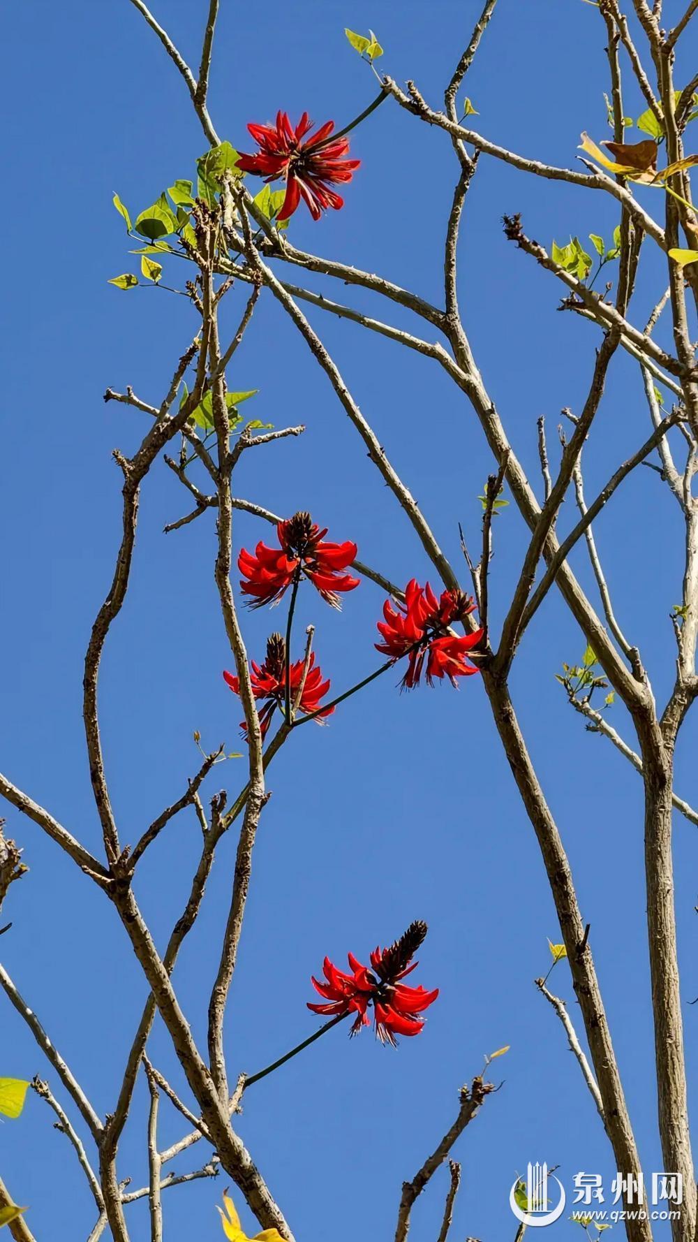 作为泉州市花,刺桐花已悄然在东湖公园探出几点鲜红,率先点亮季节的序章。