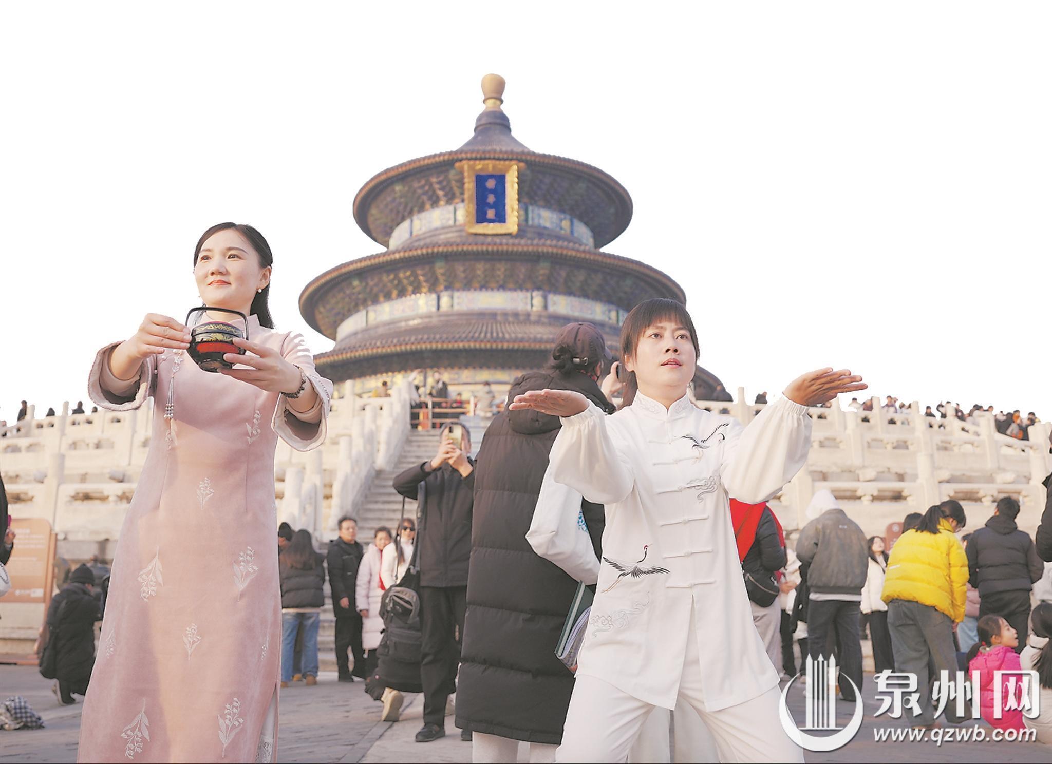 活动期间,永春非遗小分队以“行进式”展演模式,在各大地标现场展示永春白鹤拳、香道、木偶戏等非遗项目。在长城、天坛等历史文化地标,永春白鹤拳的刚健与古建的庄严相得益彰;在国家大剧院、中央电视台等现代建筑前,香道的雅致、木偶戏的灵动与现代建筑的线条美相互呼应;在鸟巢、水立方等奥运场馆及北京胡同、景山公园、颐和园等景区,非遗展演成为流动的风景线,吸引大量市民游客驻足观看、互动体验。