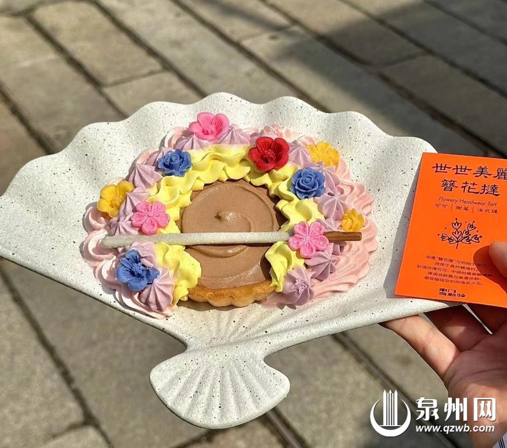 在市区一家甜品店,“簪花挞”将蟳埔女的“头上花园”转化为盘中美味,奶油“描绘”出五颜六色的玫瑰花、茉莉花等,搭配蛋挞皮烤制,既保留了闽南簪花的美,又融入了西式甜点的精致,让食客在品尝的过程中感受蟳埔民俗与饮食文化的碰撞。此外,在甜品零食中,还有清源山老君岩造型、滴水兽造型的特色饼干等,它们多以泉州景点和非遗等元素为基础,加入铁观音碎、花生末等本地食材,制成创新品类的小零食。