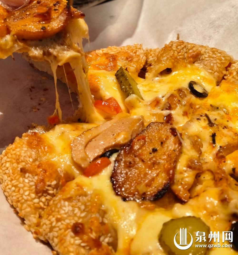 你吃过姜母鸭披萨吗?你喝过铁观音咖啡吗?来泉州,你可以体验到这样的创意美食。西街作为泉州古城的烟火地标,更是食材跨界创意的迸发之地。在西街的一家融合西餐厅,姜母鸭披萨成为游客的首选。这道美食堪称闽南菜肴与西式烘焙的精妙对话。姜母鸭是泉州美食的代表,据商家主理人介绍:“这道菜精选泉州正番鸭,经黑麻油煸炒后,醇厚肉汁与辛香姜韵交融。薄脆饼底铺上拉丝奶酪,层层叠入酥软鸭肉与焦香姜片,烘烤时酒香与姜气交织,奶酪的绵密中和了鸭肉的丰腴,每一口都兼具砂锅慢炖的温润与披萨的香脆。”去上海读书的小叶回到泉州,去西街试了这款新潮创意菜,他感叹:“很新颖的体验,让乡愁滋味有了新潮表达。”