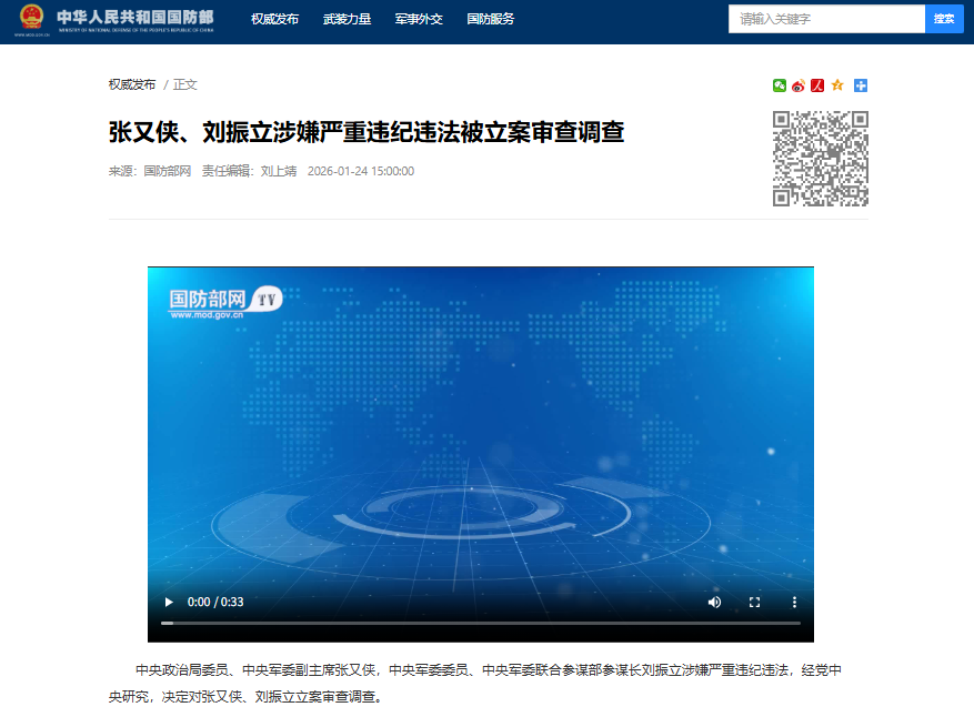 中央政治局委员、中央军委副主席张又侠,中央军委委员、中央军委联合参谋部参谋长刘振立涉嫌严重违纪违法,经党中央研究,决定对张又侠、刘振立立案审查调查。
